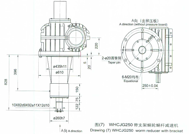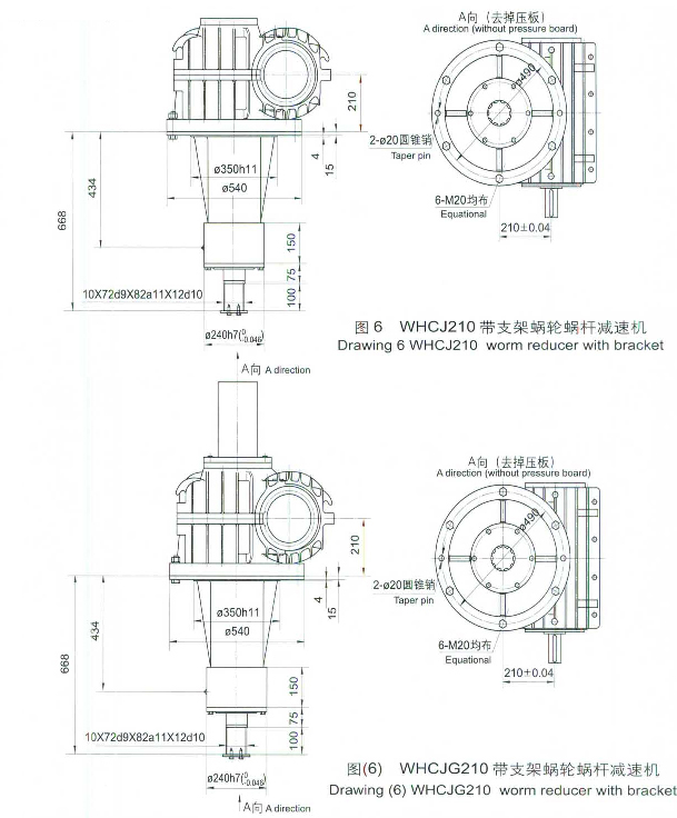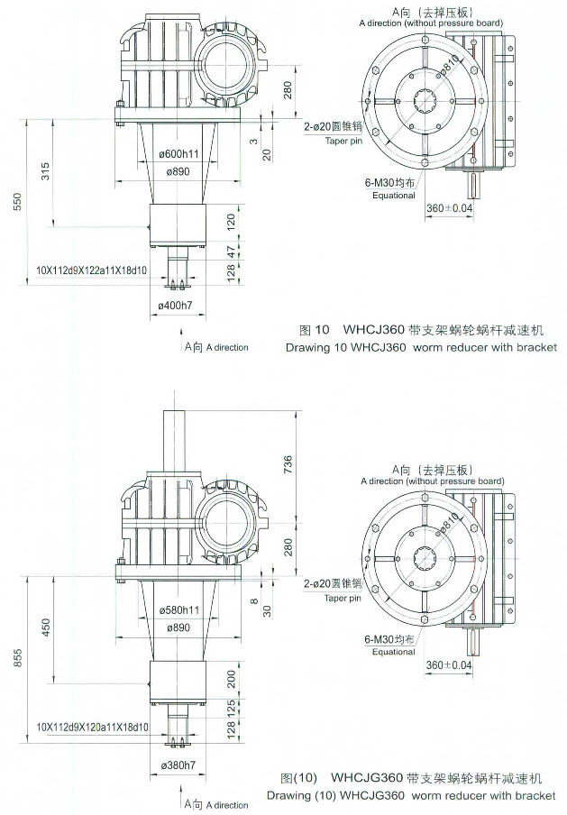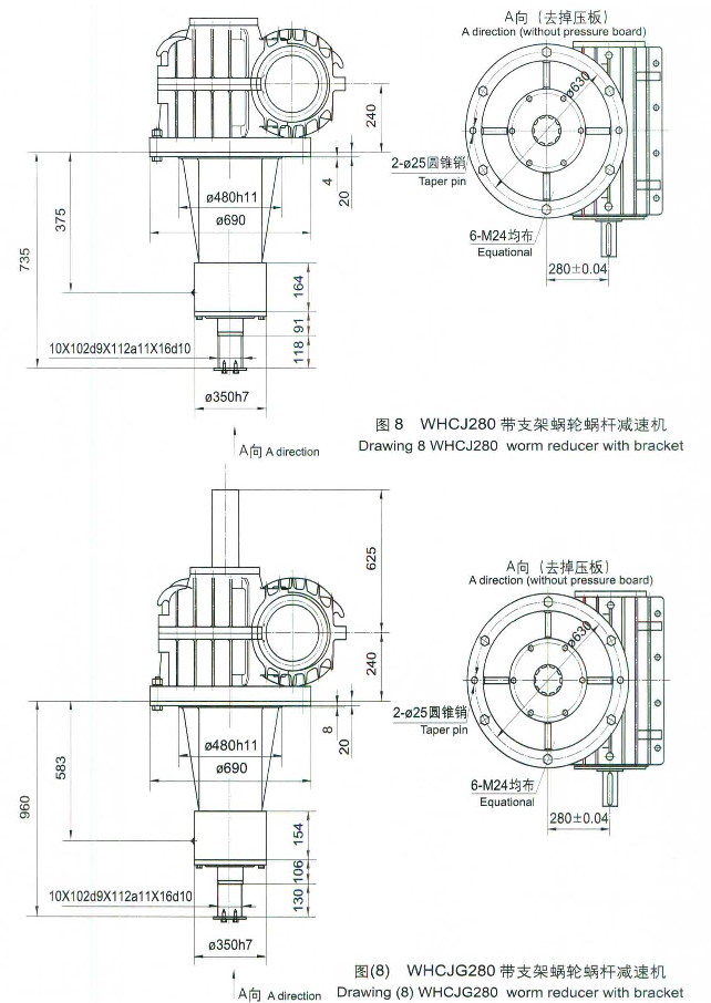一、概述 WHCJ(帶支架型)、WHCJG(帶過載保護型),是在WHC產品基礎上的改進型港口專用減速機。外型尺寸見圖6一圖10。除圖中所示尺寸外,其余尺寸和速比均借用標準WHC系列,此減速機主要用于港口機械設備的減速傳動。